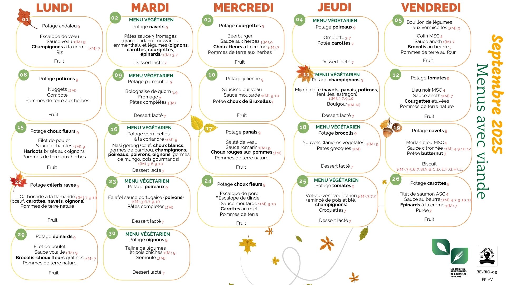 Menu du mois de septembre à destination des écoles d’Evere et Auderghem