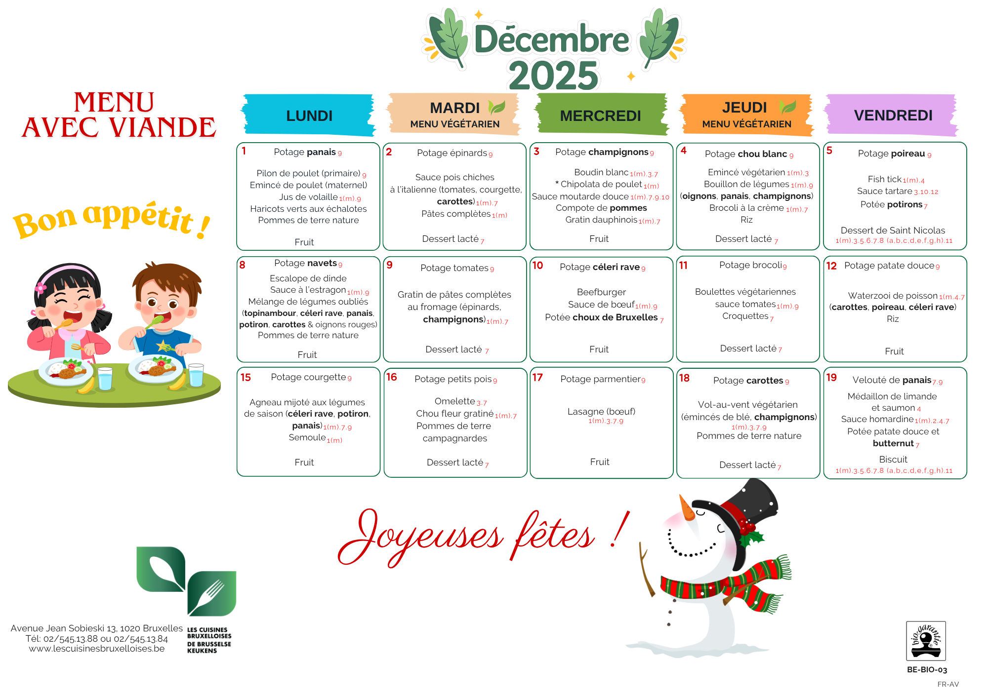 Menu à destination des écoles d’Evere et Auderghem