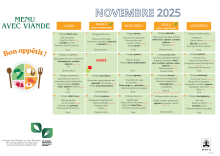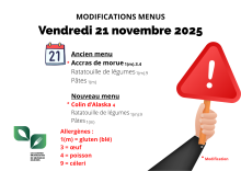 Suite à un problème d'approvisionnement, nous sommes dans l’obligation de modifier le menu du vendredi 21 novembre comme suit :
