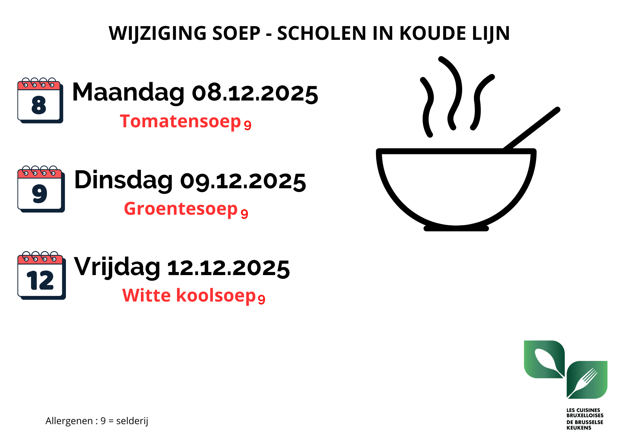 Als gevolg van een technisch probleem in onze keuken in Haren zijn wij genoodzaakt wijzigingen aan te brengen in de oorspronkelijk geplande soepen. Wij danken u voor het noteren van de volgende aanpassingen :